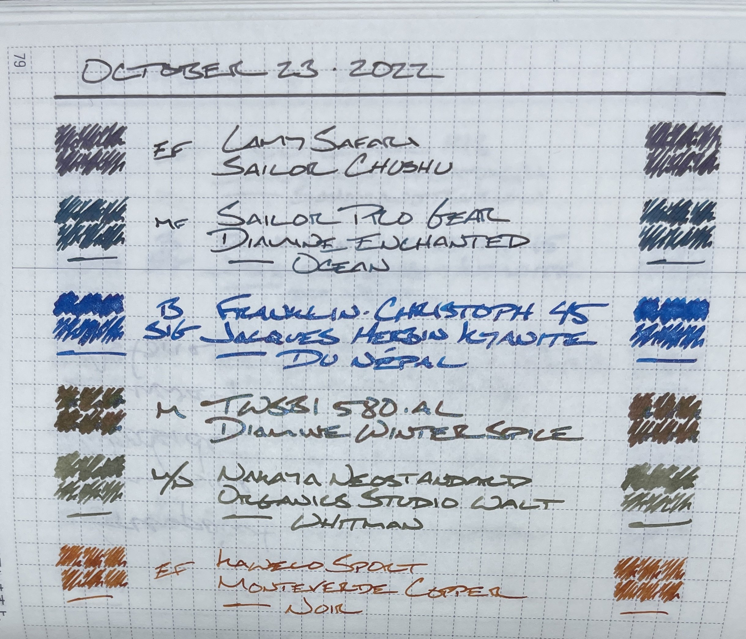I enter this week with an eclectic six-pen currently inked. Nib size drives my selection. The color, size and weight of each pen were only secondary considerations.