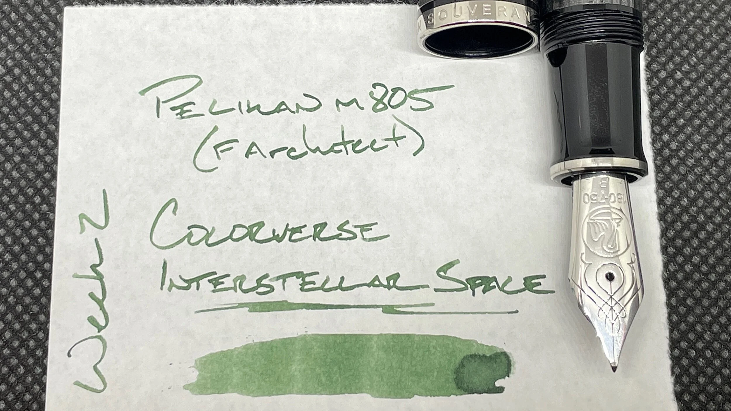 Pelikan m805 Stresemann Anthracite (F Architect, by Custom Nib Studio). Colorverse Interstellar Space. The only earth toned ink I plan to include in core spreads for my work bullet journal. The pair is also the accent color for this week’s task management in my Hobonichi Weeks. The Architect grind allows me to write both as a F and as an XXF — helpful in the tiny Hobonichi grid. Commonplace notes (accent), journaling, bullet journal headings, task management.
