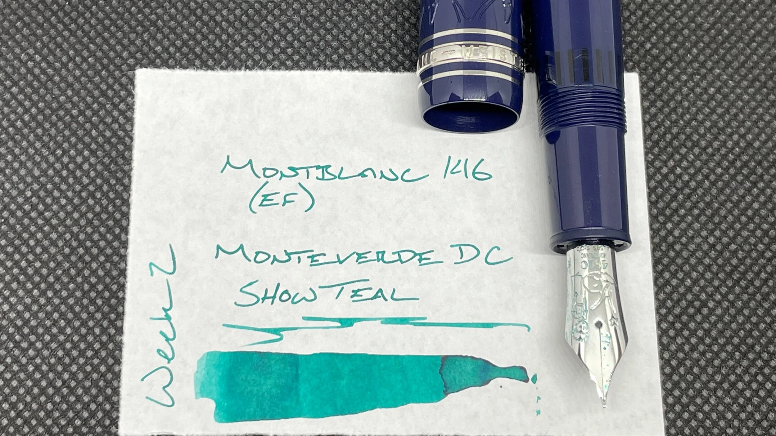 Montblanc 146 Le Petit Prince and Fox (EF). Monteverde 2019 DC Supershow Teal. This pair produces a narrow, Japanese EF line width. Teal remains bright, even where shaded. The combination makes this pair excellent for accent notes while commonplacing, and for accenting tasks or events in my Hobonichi Weeks.
