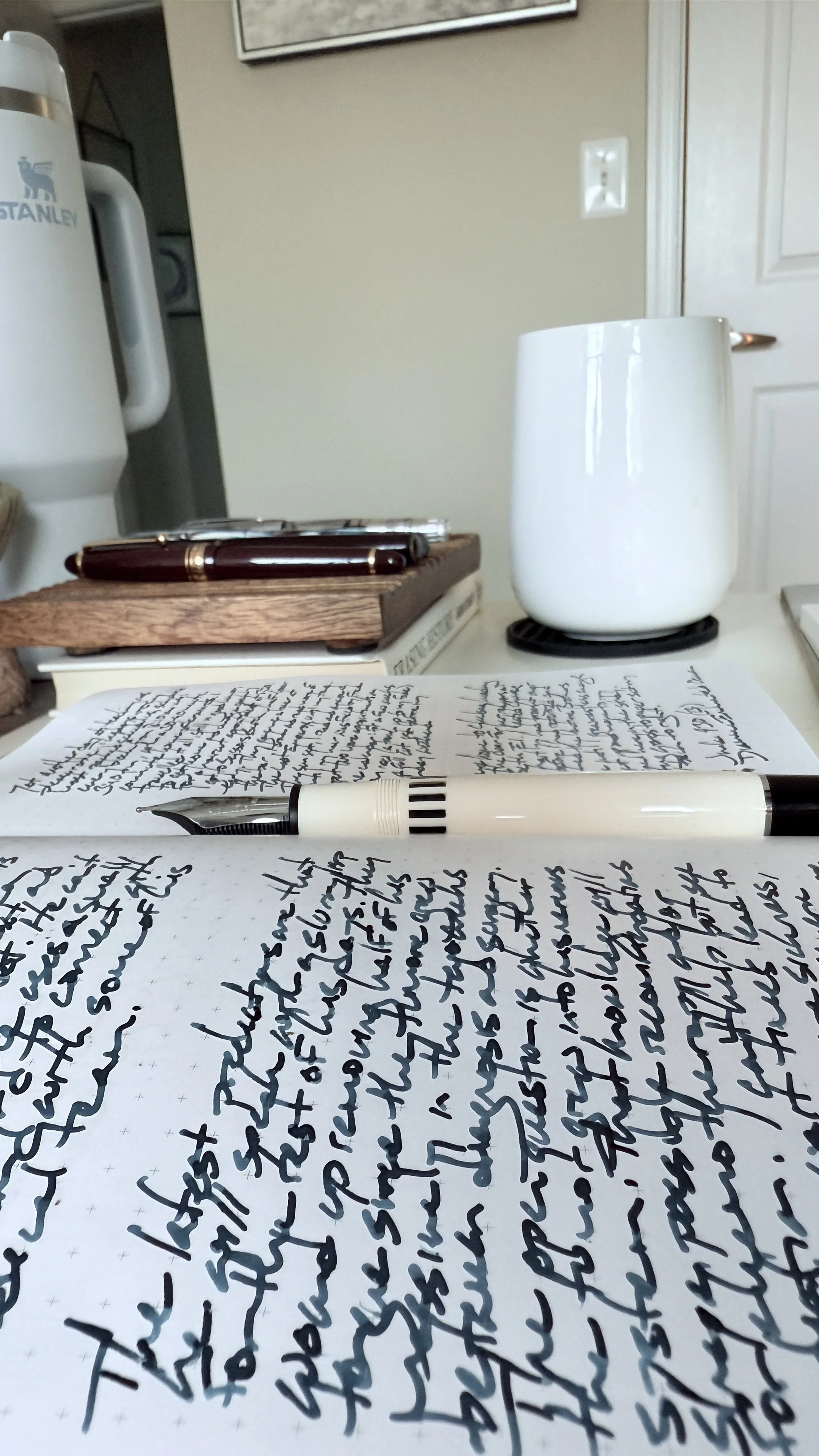 Reviewing my journaling emphasizes that I favored B and M nib options throughout the week’s reflections. Wide lines made for prominent shading. Wide lines also fill up pages more quickly than would narrow line widths.