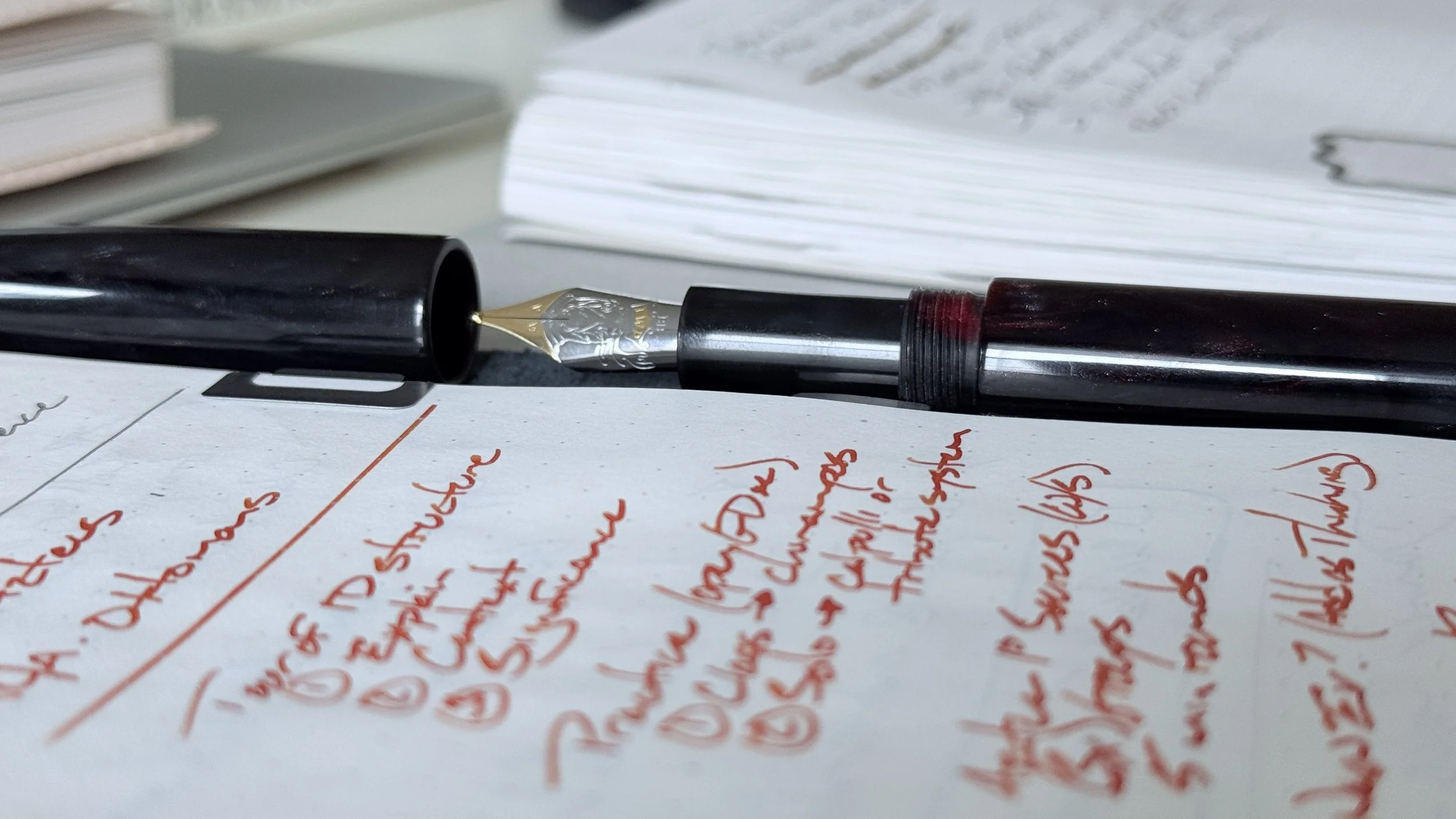 - Mythic Aeschylus (BB). — Empty. The BB nib rapidly tore through a converter’s worth of ink. Smooth, tasteful feedback while writing. Excellent for accenting meeting notes and for scannable lesson outlines.